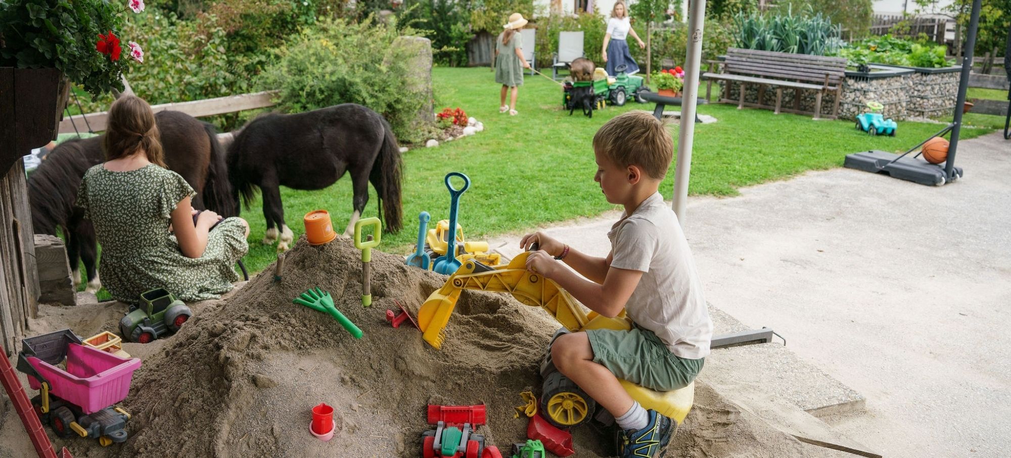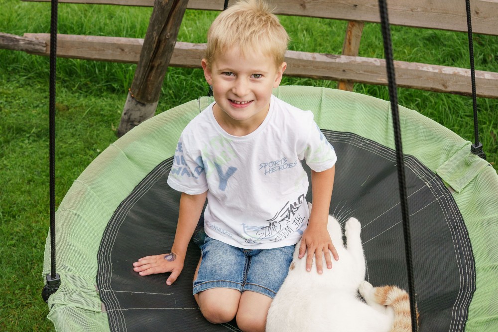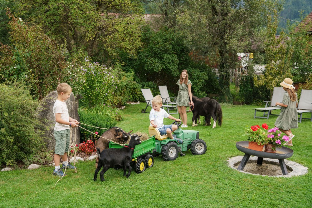 Zum Toben, Klettern und Spielen lädt der liebevoll gestaltete Gartenbereich ein – ein gemütlicher Ort, an dem Kinder ihre Neugier entfalten können, während die Eltern eine entspannte Auszeit am Land genießen und ihren Kindern beim Spielen zusehen.